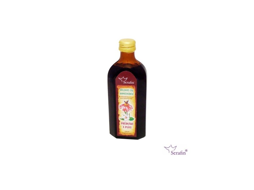 Čajový koncentrát Průdušky a plíce Serafin obsahující bylinky jako je kopřiva, podběl nebo mateřídouška vyráběný bez chemie a cukru. Pasterizováno.